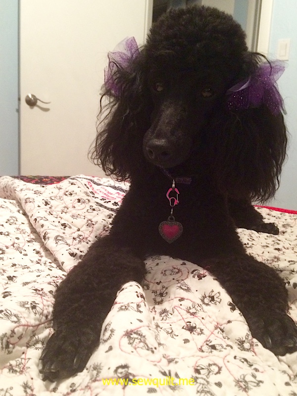 Marcie is also a dog lover, so I added some wooden dog buttons I found in Houston a few years ago. There is a poodle on the upper right of the quilt. Emmie is Marcie's miniature poodle.