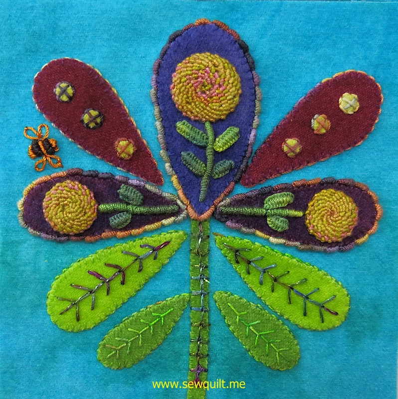I am stitching on too many large wool projects at the same time, so I am not sure when I will start stitching the fifth block of Solstice Dream. Most of the blocks are 6", the stitching is not as intense as stitching on Fresh Cut, Sue Spargo 2017 BOM, so I do find stitching on Solstice Dream a pleasant break between my Sue Spargo projects.