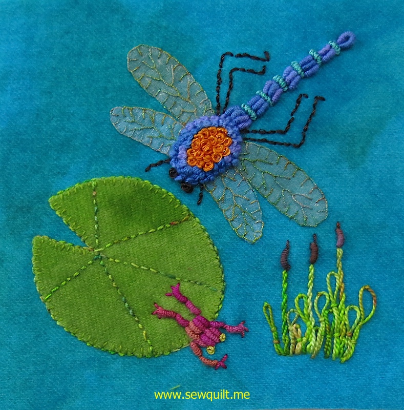 I was a bit worried about stitching the dragon fly tail and frog, I was worried the bullion knots would not be round and plump. The frog and the periwinkle bullion knots of the dragon fly tail were stitched with Thread Gathers silken pearl. Silken pearl is a 100% silk thread with a tight Cordonnet twist that is about a size 5 pearl thread. The tight twist of the silken pearl creates firm stitches with a gorgeous sheen. The dragon fly wings were cut from a sheer, organza-type ribbon and stitched down with Painter's Metallic Braid thread.