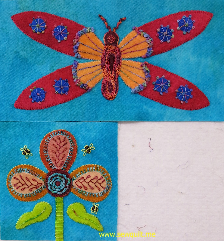 Block 2 gave m the opportunity to learn the Basque stitch, which is illustrated in Yvette Stanton's book, The Right-handed Embroiderer's Companion. Yvette's book is an excellent reference for learning embroidery stitches and her Left-handed Embroiderer's Companion is an excellent guide for left-handed stitchers. The Basque stitch gives a beautiful picot edge to the inner flower petals. The bees are stitched with Dazzle thread.