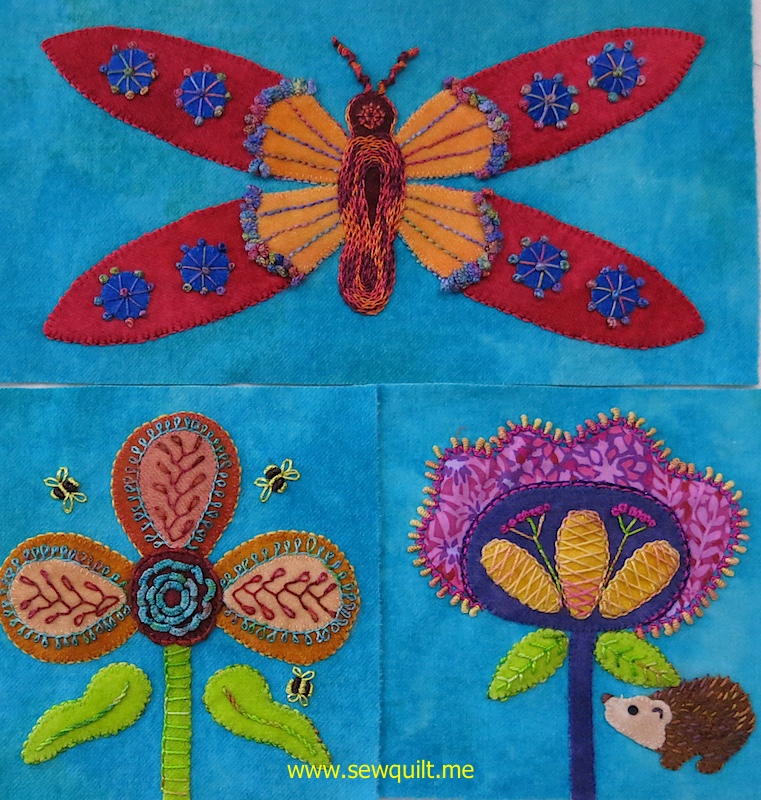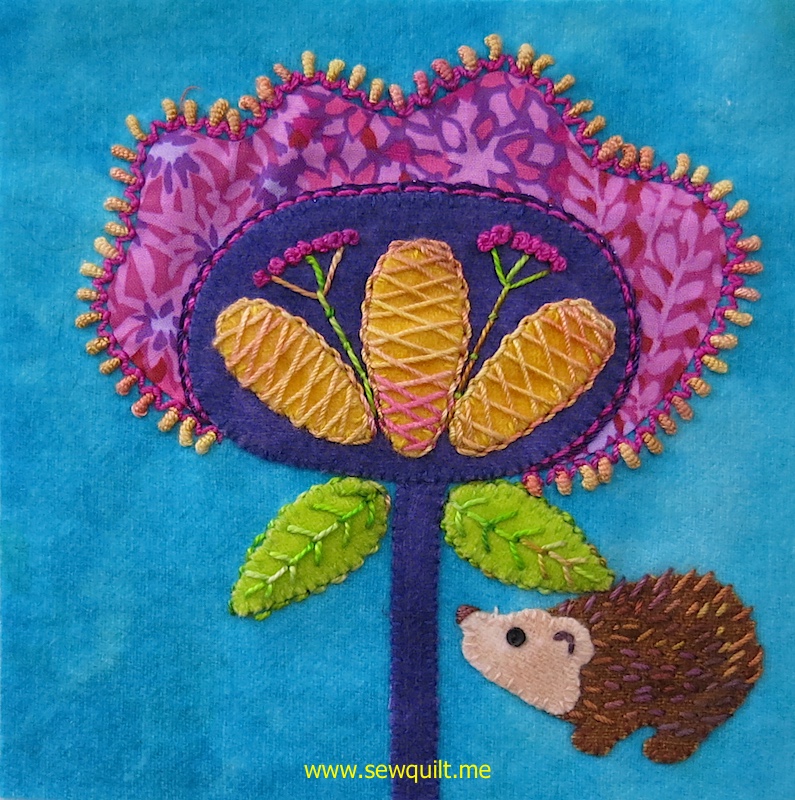 This block gave me a chance to learn a new stitch. The 3 marigold petals are stitched with the double Pekinese stitch. The double pekinese stitch looks complicated but really was quite easy to stitch. First, I stitched a backstitch around each marigold petal and then threaded another thread through the backstitches which gives the stitch a braid-like appearance.